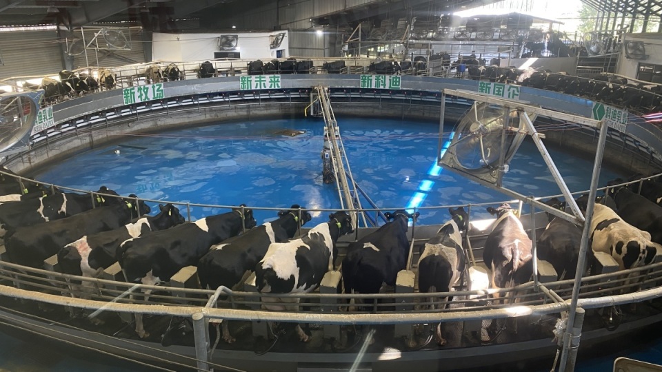 “这个转盘有80个挤奶位,每个位置正好站下一头牛,牛走上挤奶位后,挤奶设备会自动与奶牛对接,自动挤奶就正式开始了!”8月29日,在商丘市虞城县B体育(中国)智慧牧场,工作人员介绍着挤奶流程。